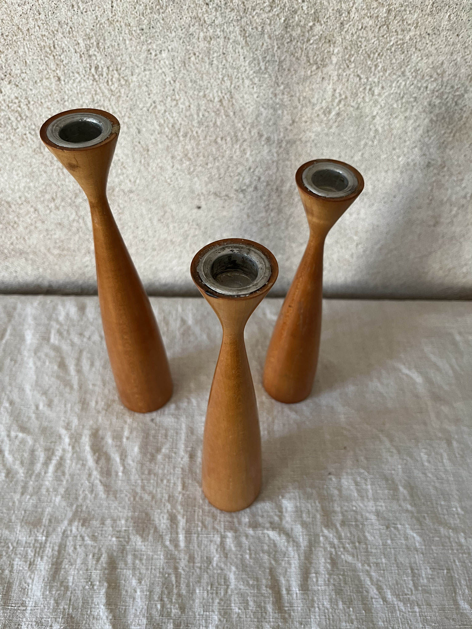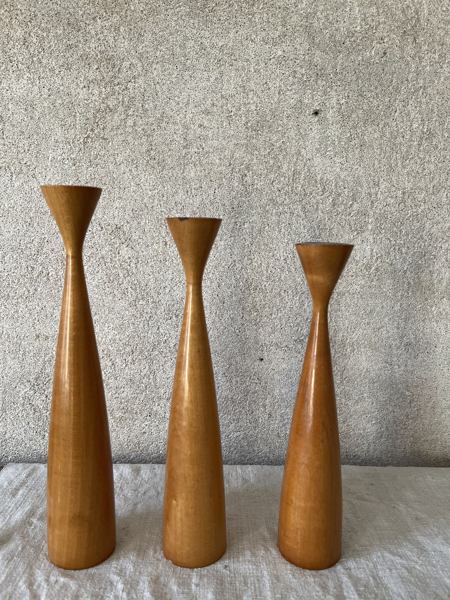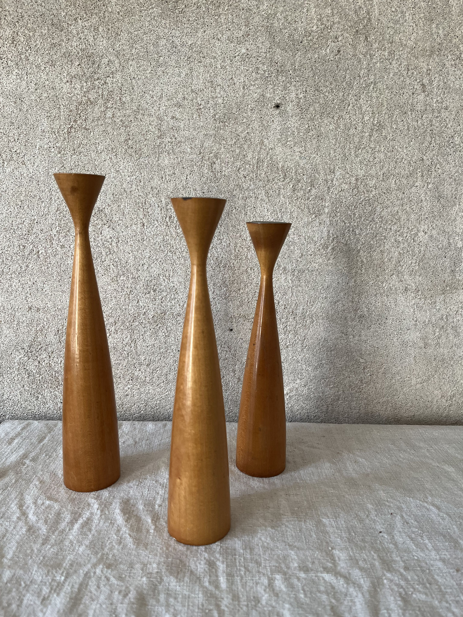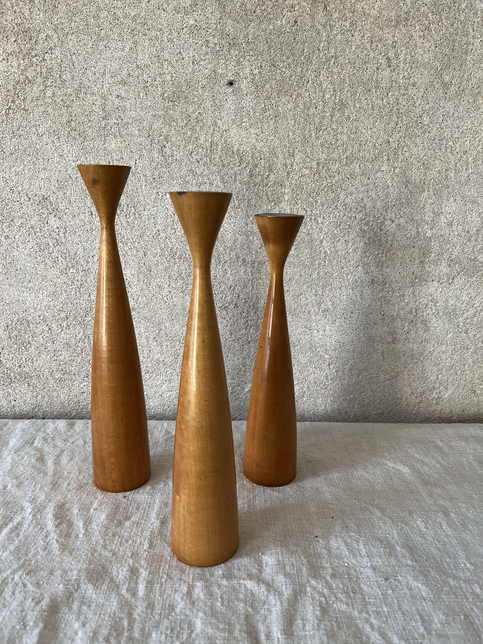 3 Vintage-Kerzenleuchter 60er - 70er Jahre aus Holz in unterschiedlichen Größen.