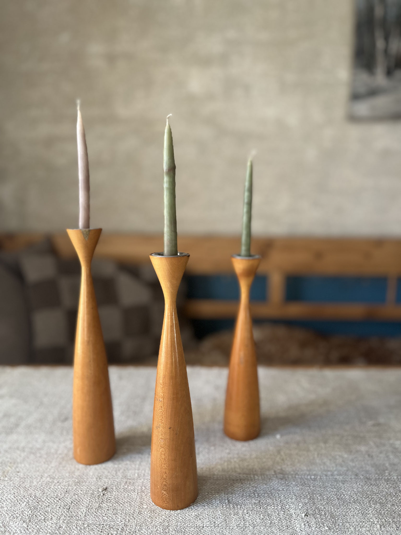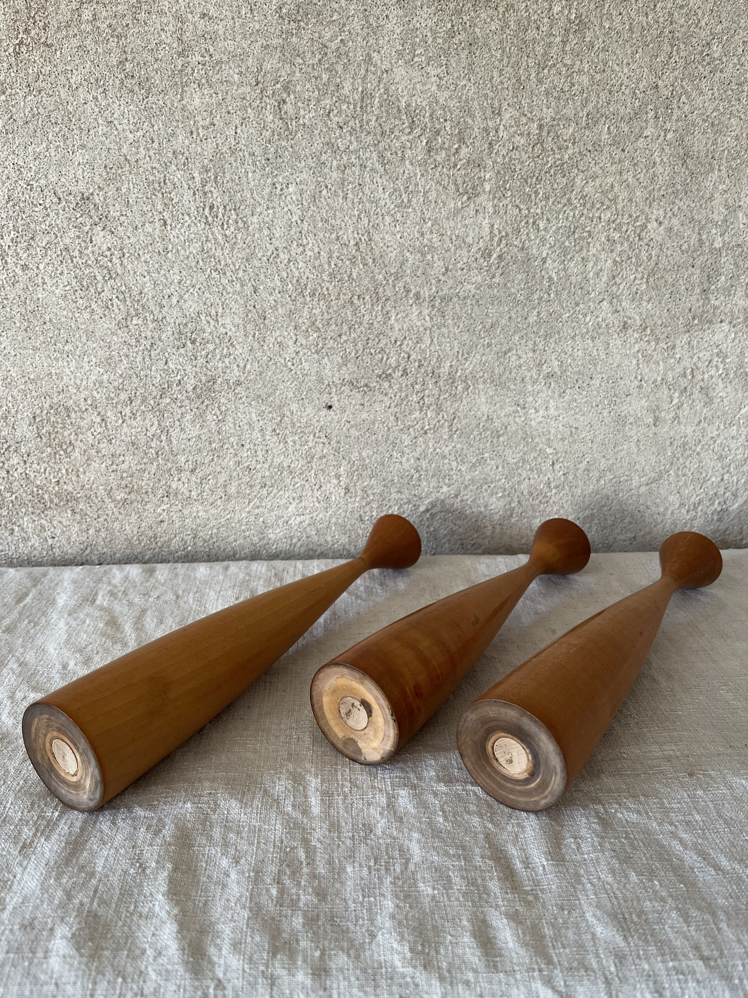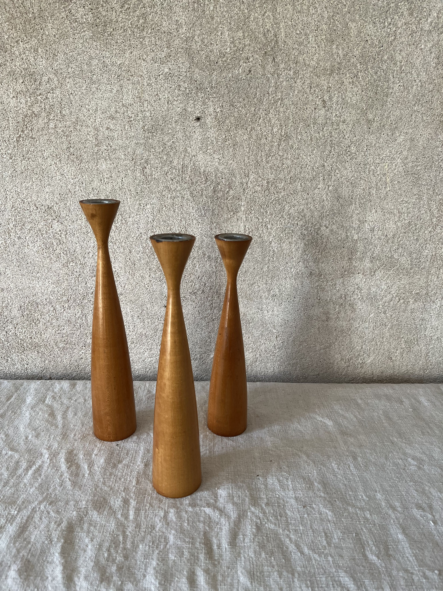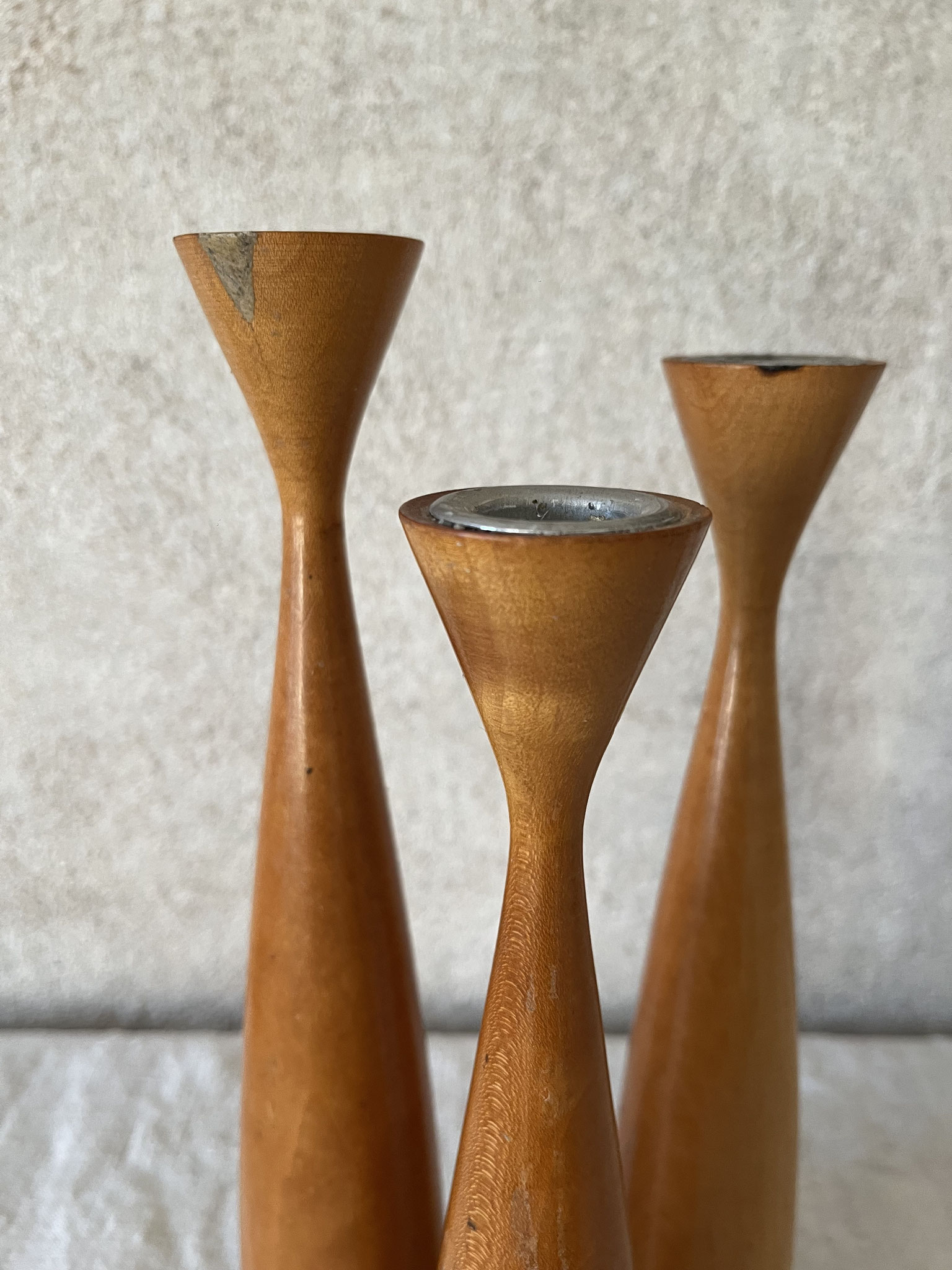 3 Vintage-Kerzenleuchter 60er - 70er Jahre aus Holz in unterschiedlichen Größen.