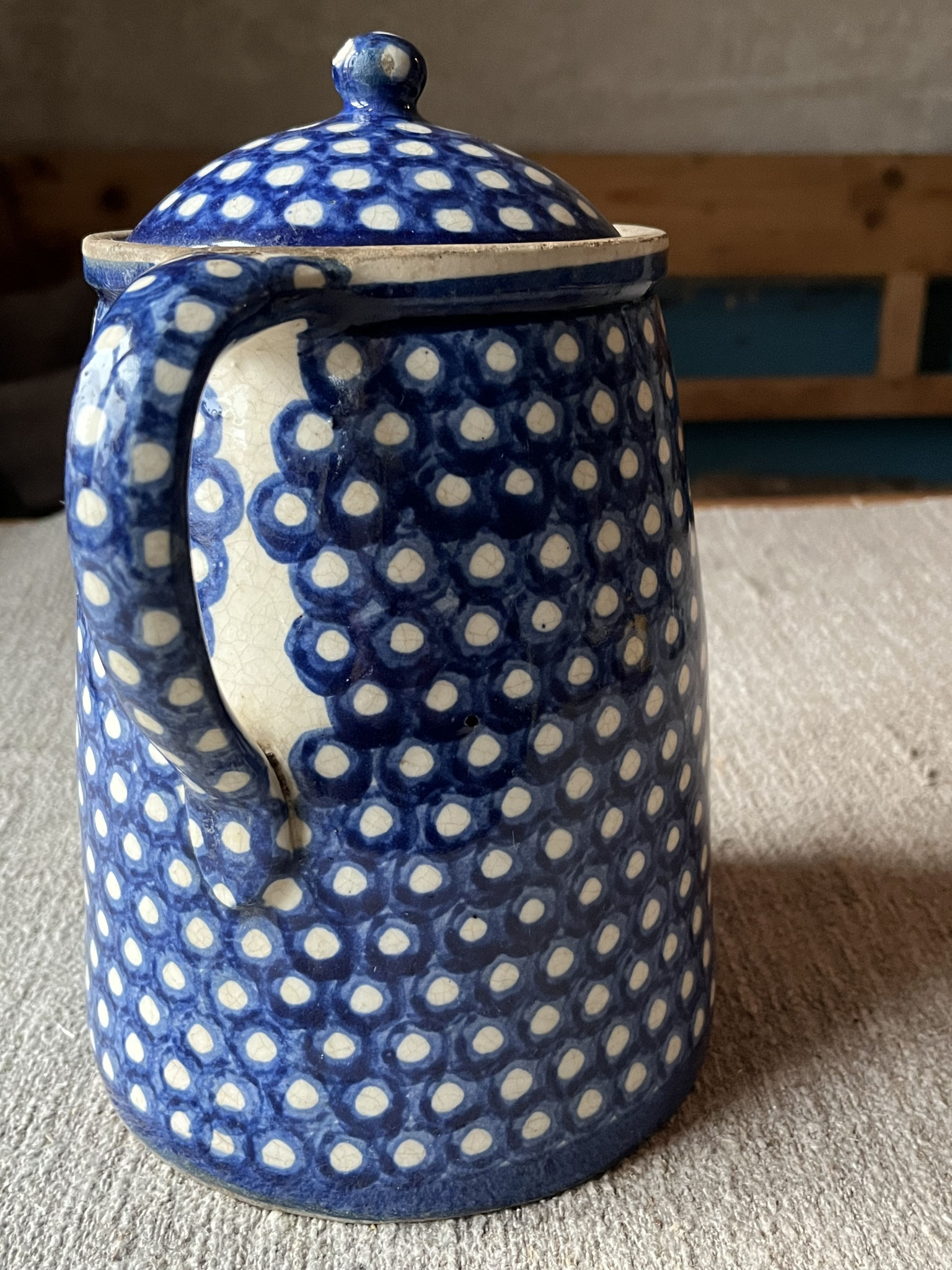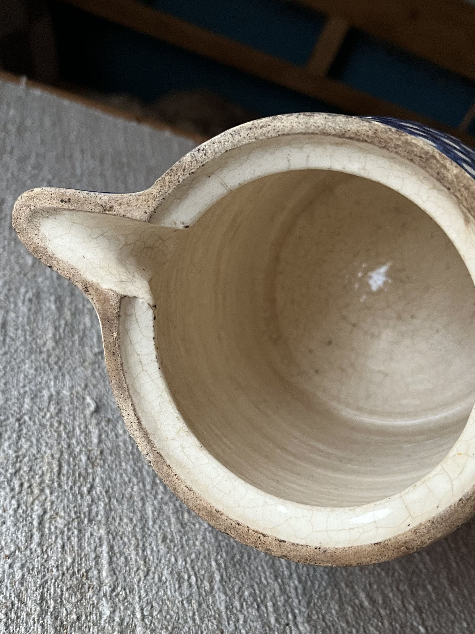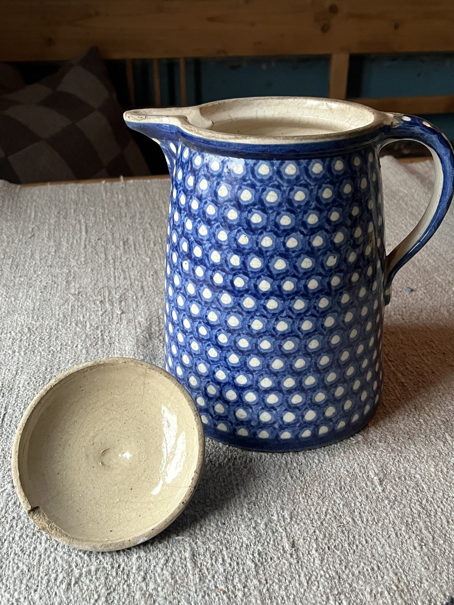 Sehr alter und großer Steingut-Krug mit Deckel / Bunzlauer Keramik