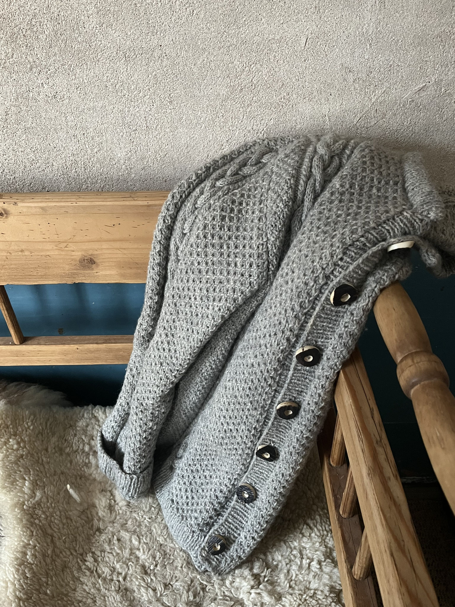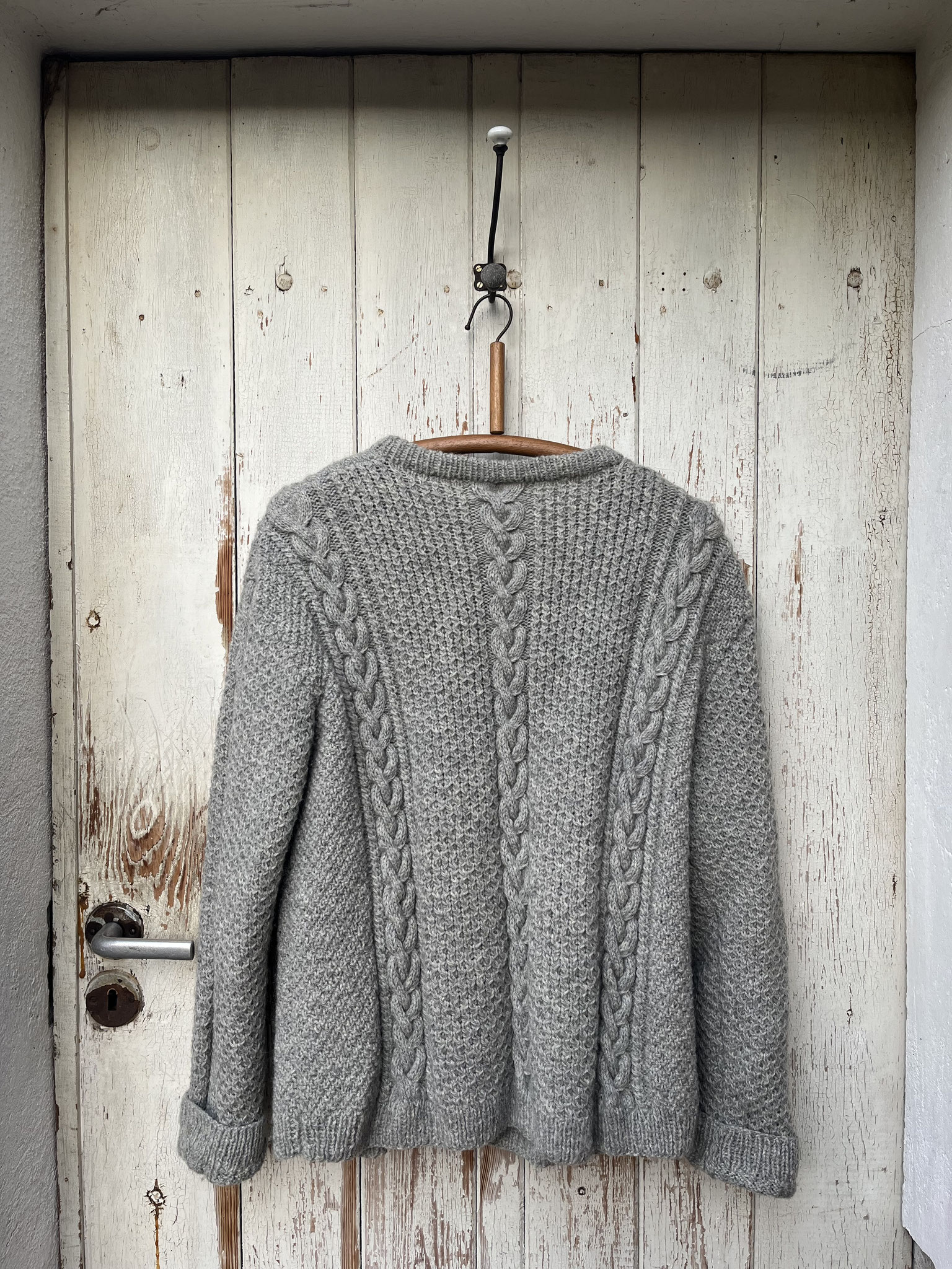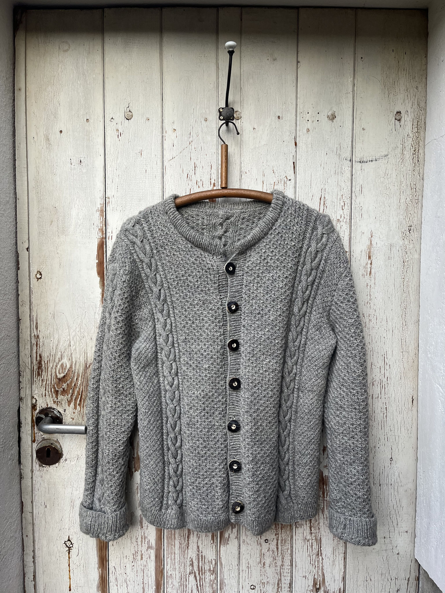 Sehr warme, dicke Trachten-Strickjacke, mit sieben Horn-Knöpfen zu schließen und schönem Zopf-Strickmuster im Vorder- und Rückenteil.