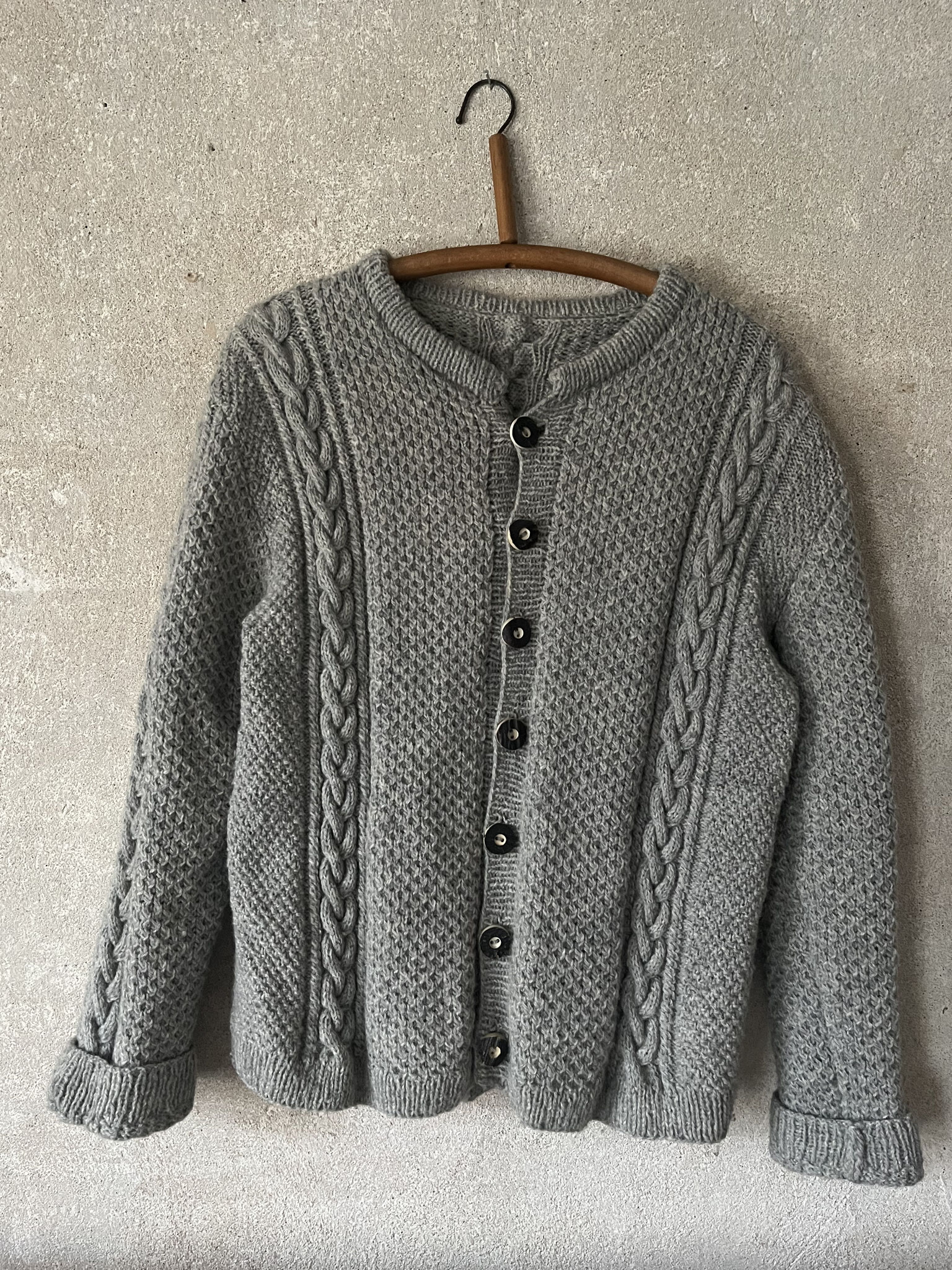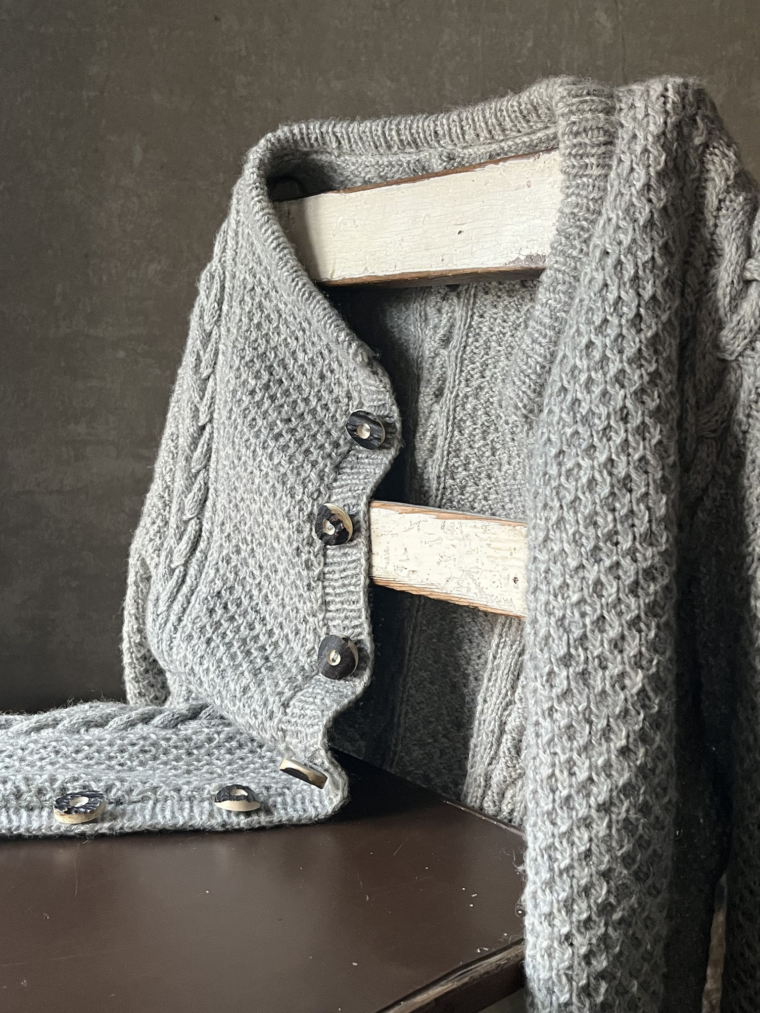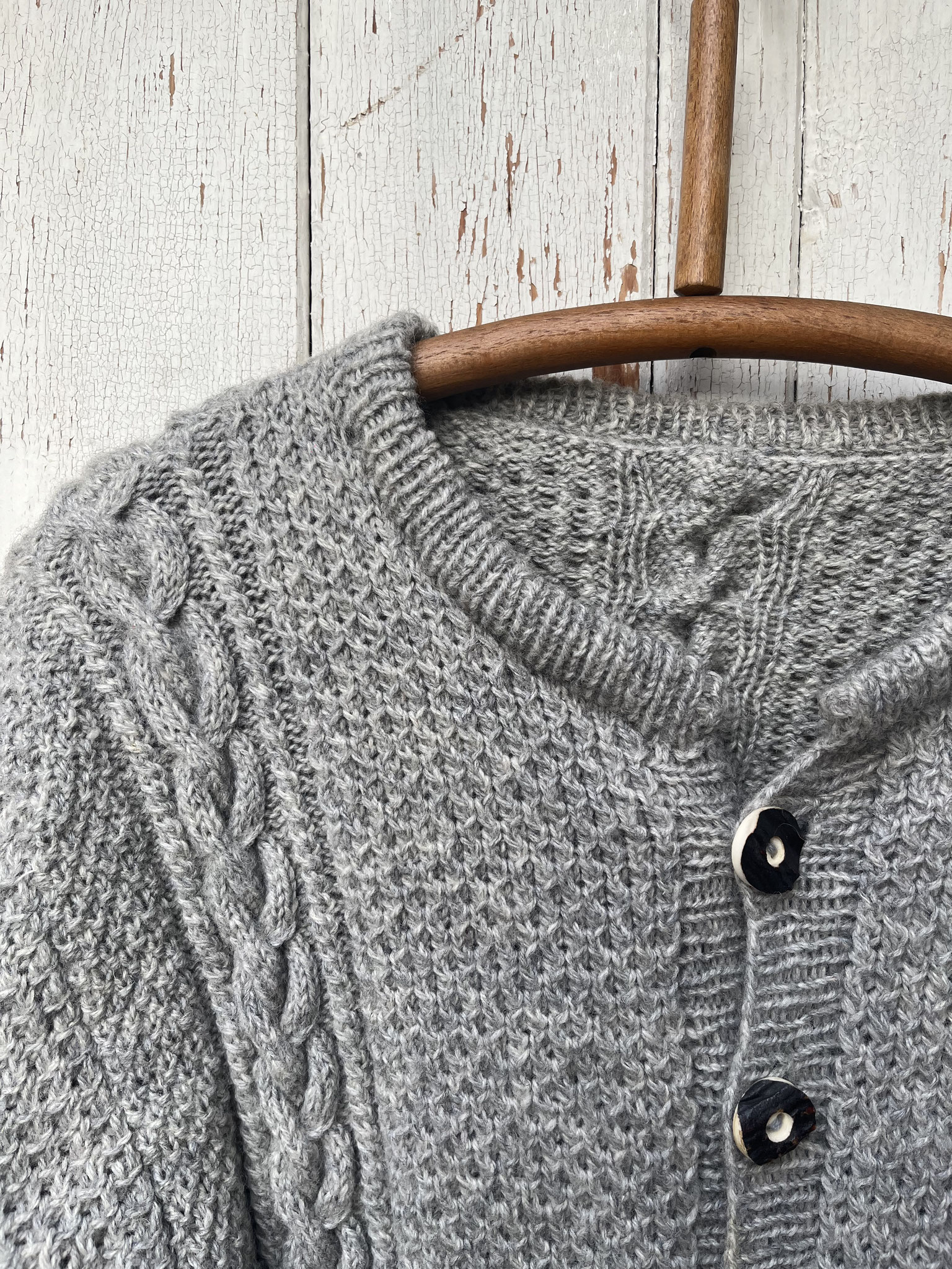 Sehr warme, dicke Trachten-Strickjacke, mit sieben Horn-Knöpfen zu schließen und schönem Zopf-Strickmuster im Vorder- und Rückenteil.