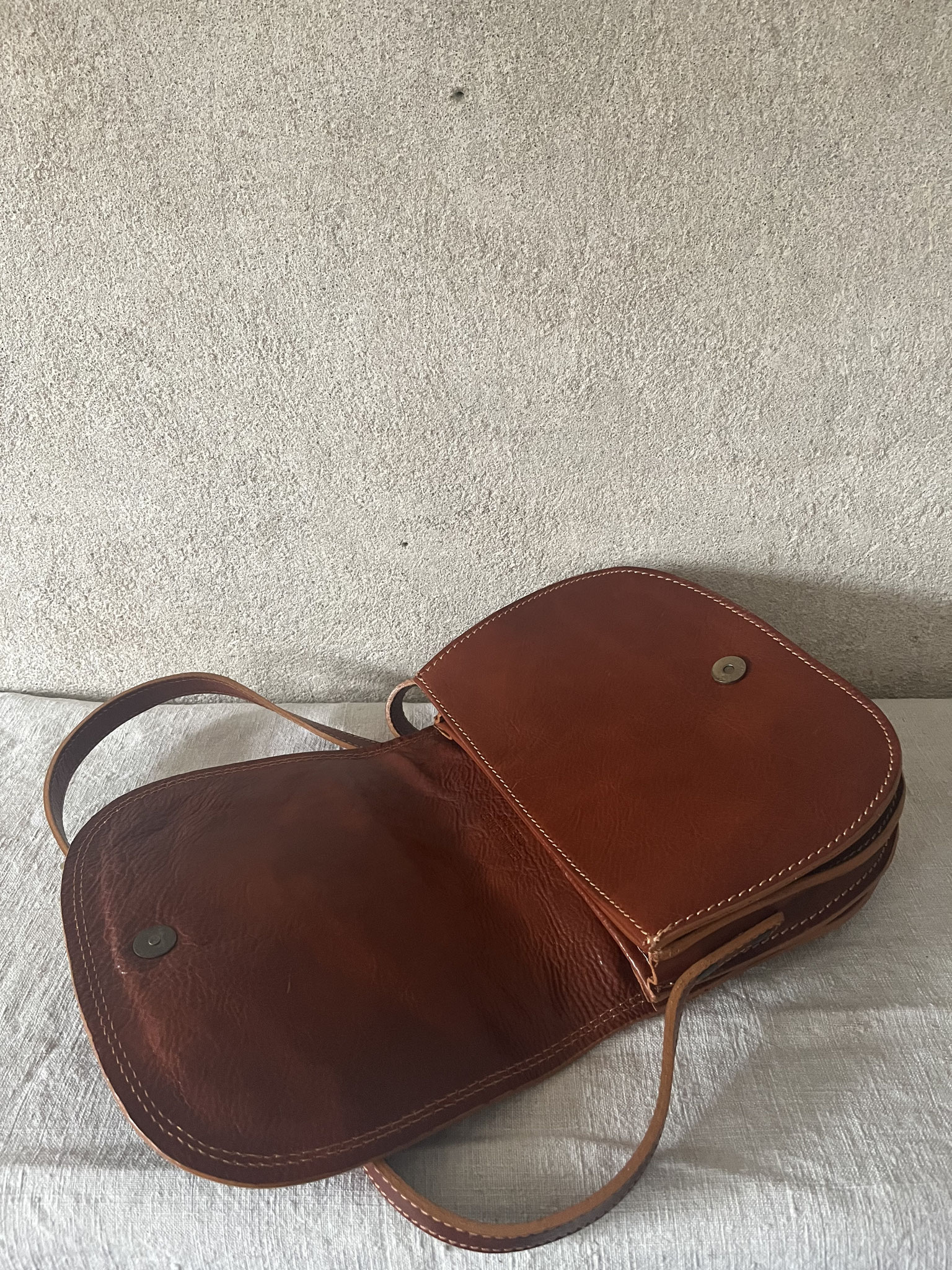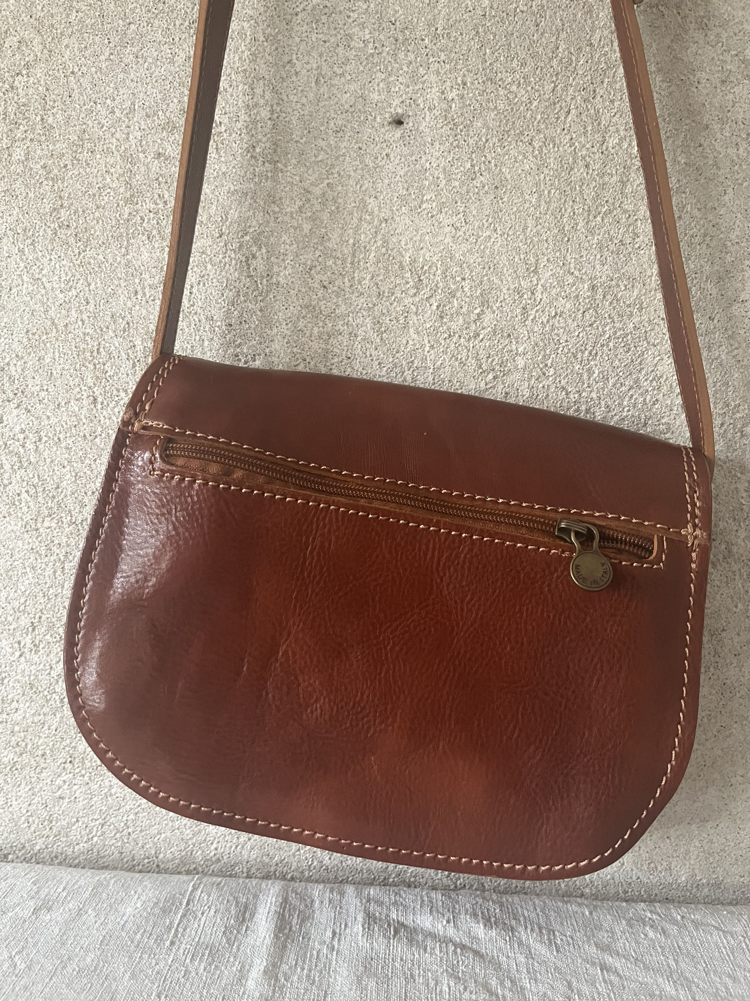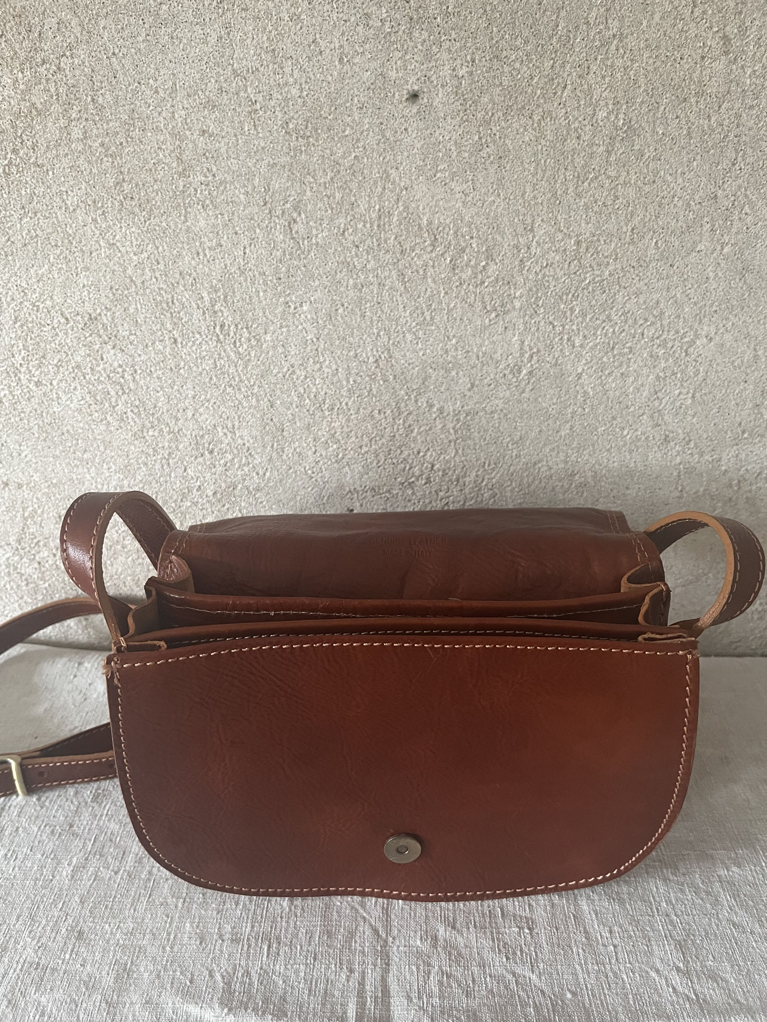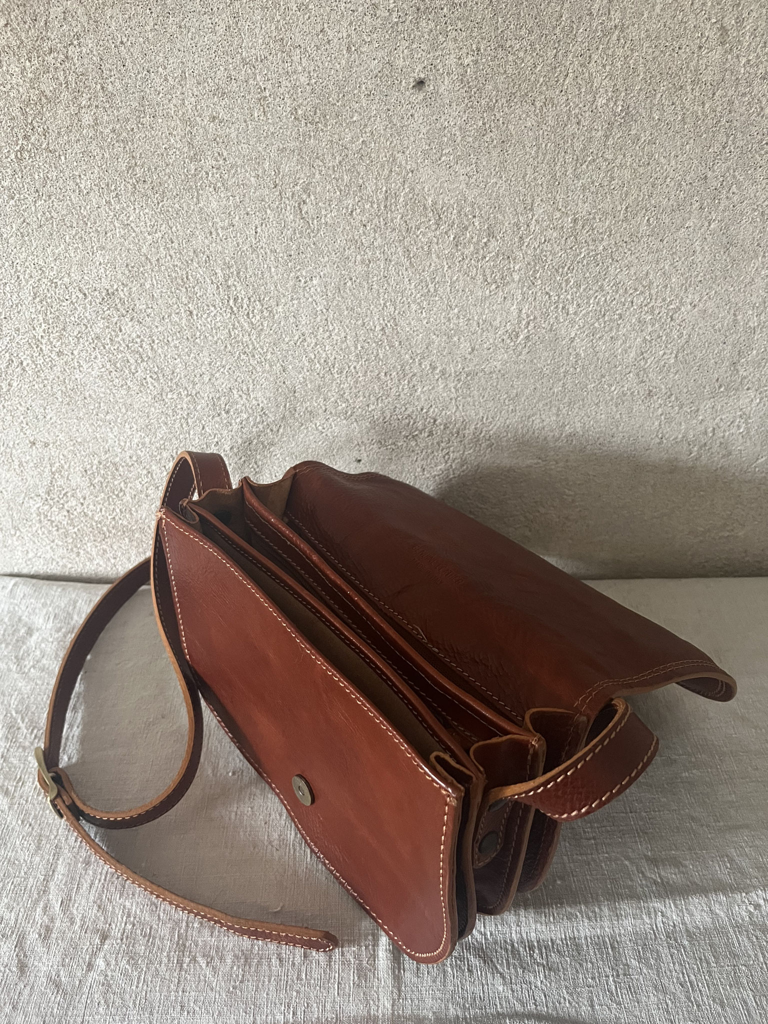 Mittelgroße, robuste Lederhandtasche mit drei Fächern, Magnetverschluß, verstellbarem Riemen und einem Extrafach an der Rückseite