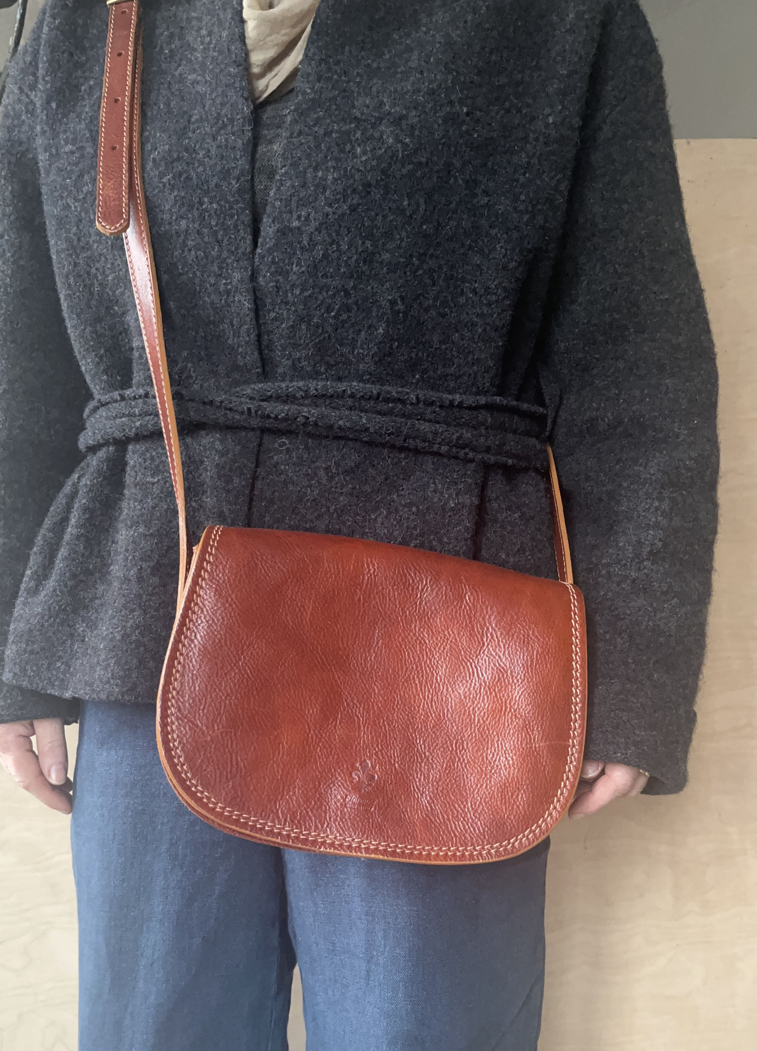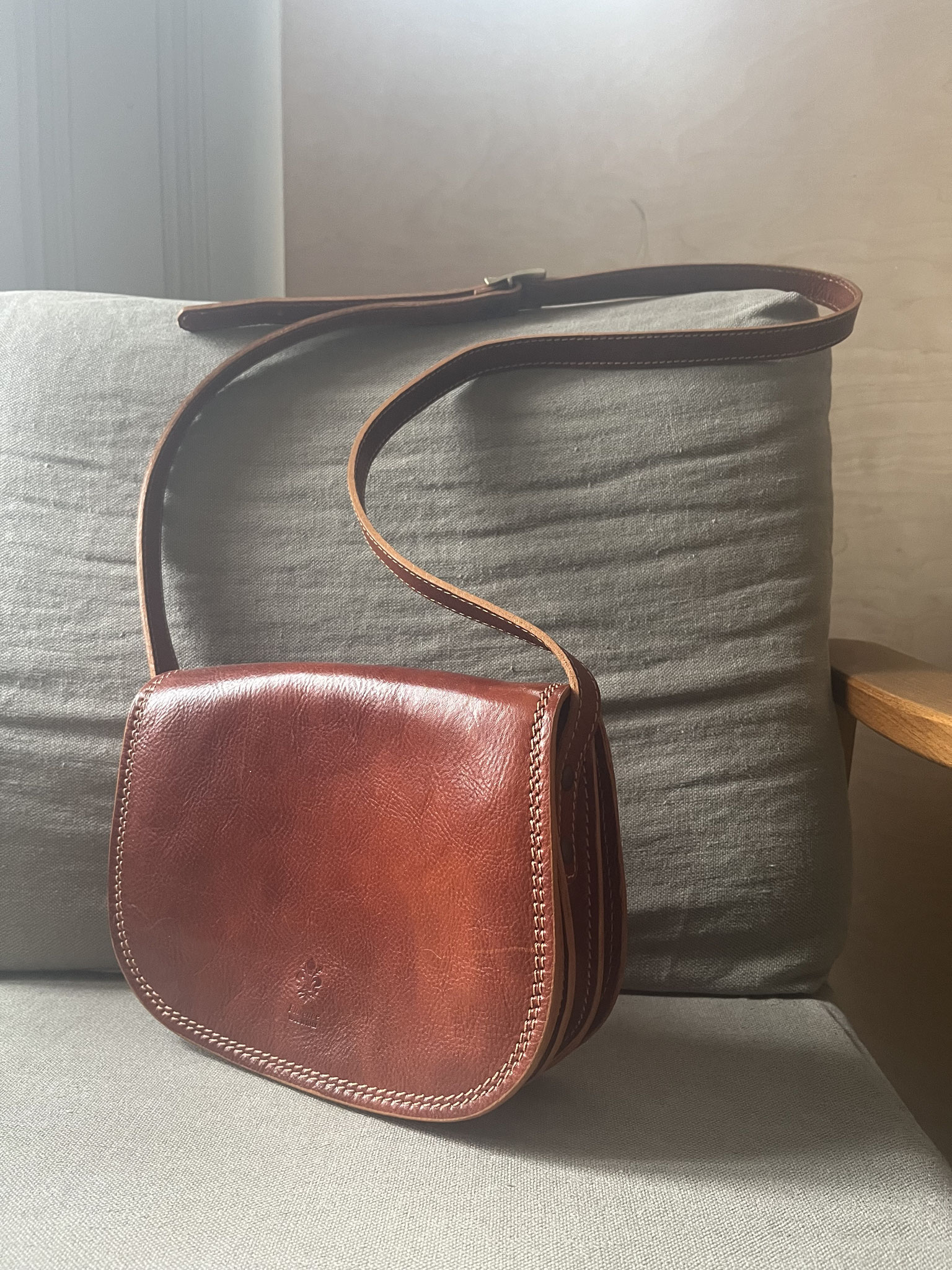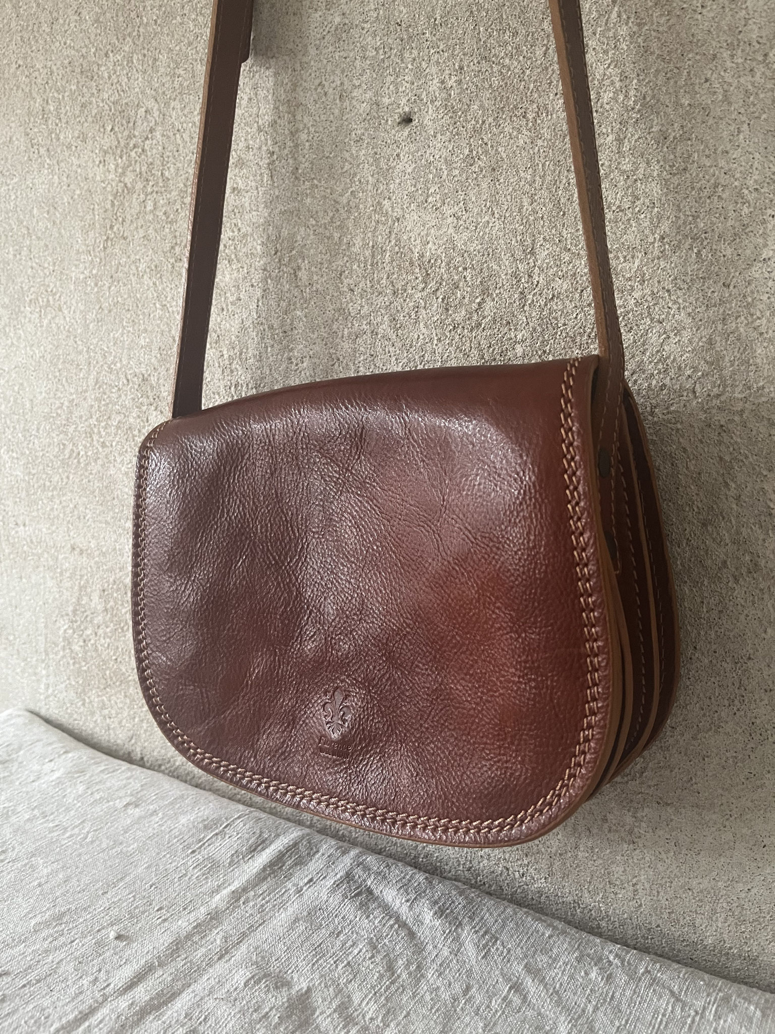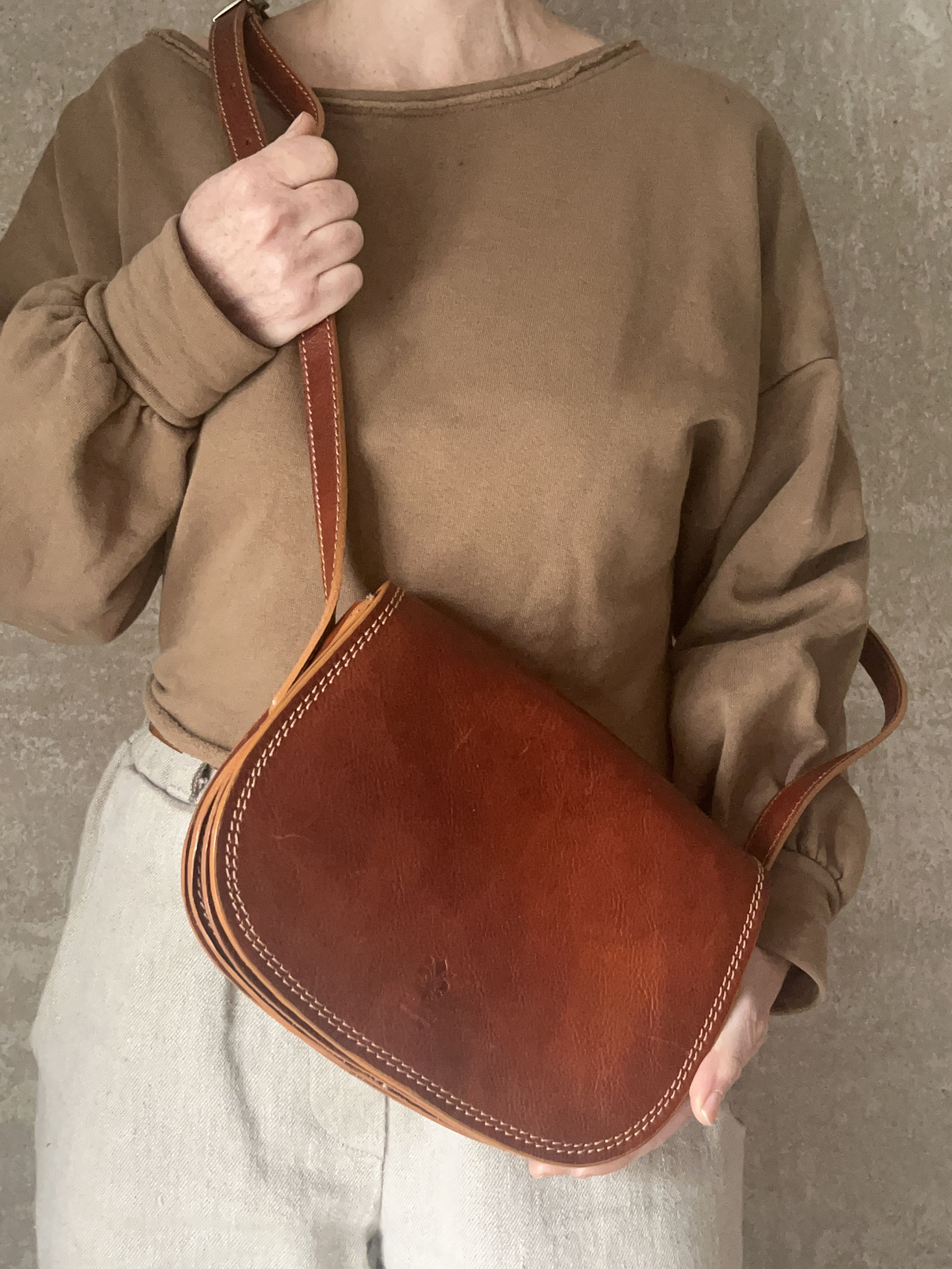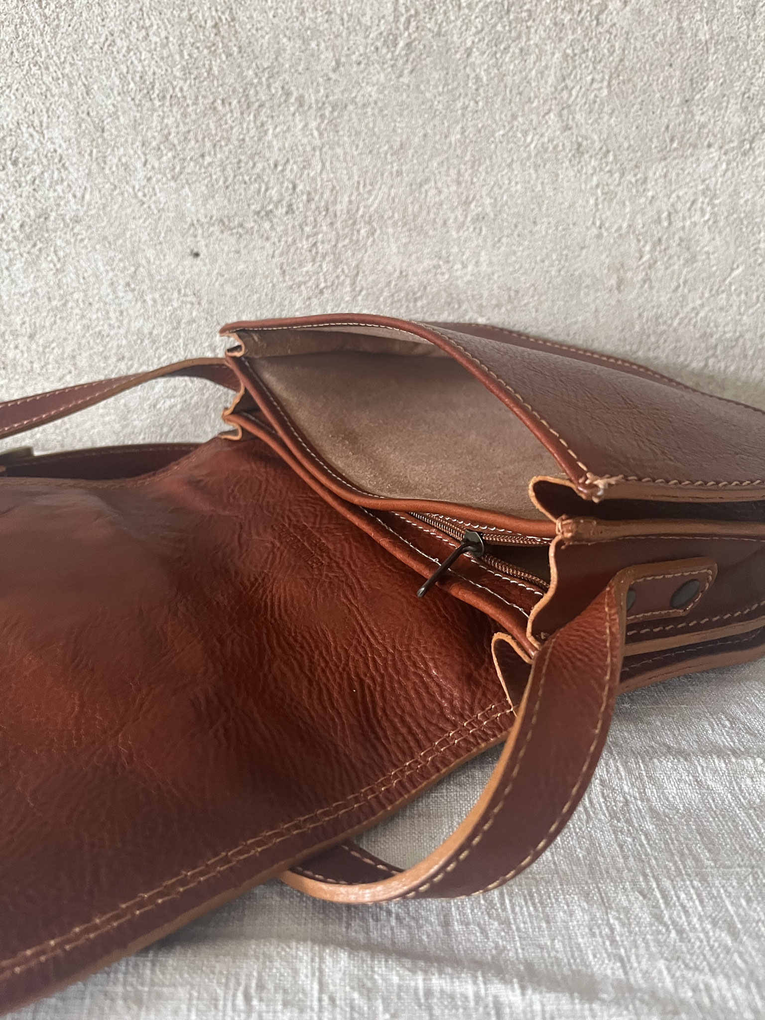 Mittelgroße, robuste Lederhandtasche mit drei Fächern, Magnetverschluß, verstellbarem Riemen und einem Extrafach an der Rückseite